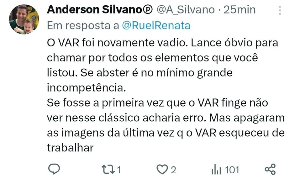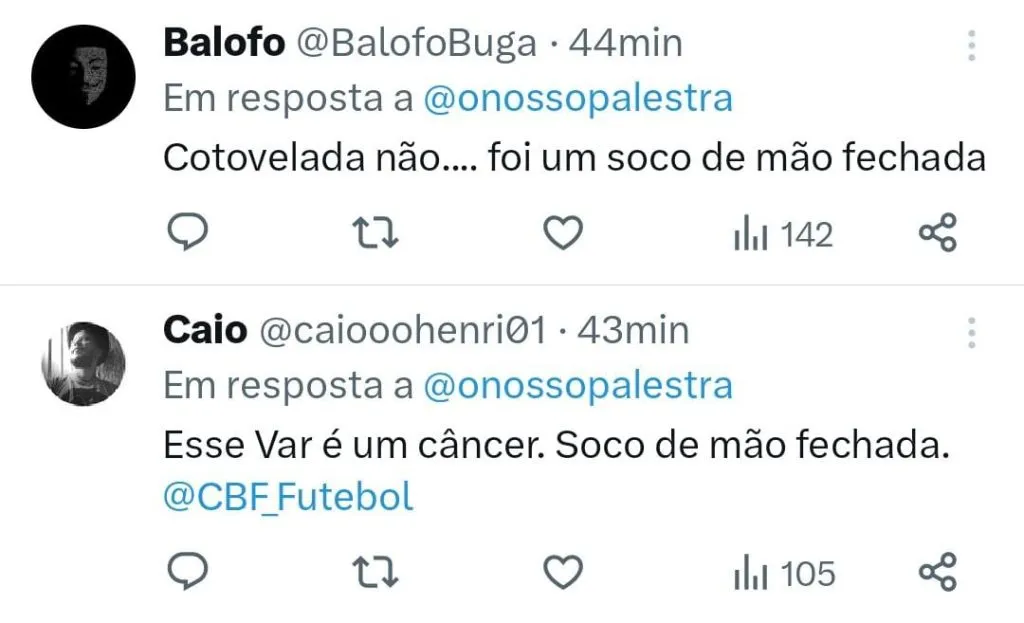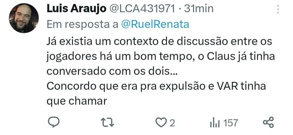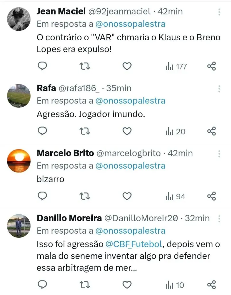 A torcida não perdoou a decisão da arbitragem, em especial a postura do VAR em não ter chamado Claus para revisar a jogada. “E o VAR não chamou o Raphael Claus para ver essa cotovelada de Rafinha no Breno Lopes. Inacreditável!”, postou um perfil alviverde no X, antigo Twitter. “Aonde cotovelada um murro com a mão fechada. Vermelho claro isso é agressão se tratando de futebol e outra coisa mais.”, respondeu um torcedor.