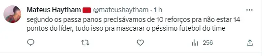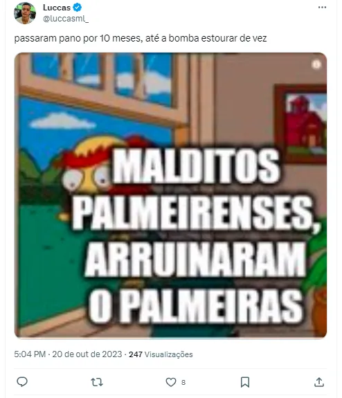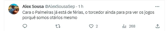 Outro internauta ainda disse que no final desta edição do Brasileirão, o Palmeiras estará com uma campanha até inferior que 2015 e 2017: “O final será pior que os dois anos (15 e 17). Hoje só tem essa pontuação porque brigou bem lá em cima até certo ponto”, resumiu. Por fim, um usuário da rede social disse que esse é o pior elenco desde 2014: “Pior elenco desde 2014, facilmente. Conquistar dois títulos, chegar em semi de Libertadores, brigar por G-4 esse ano ainda é milagre”, completou