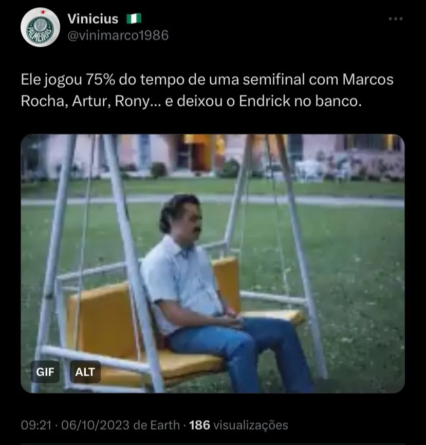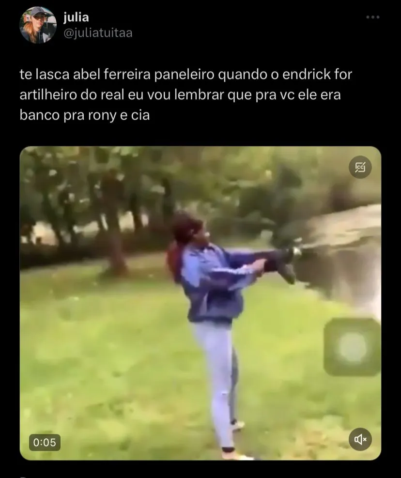 “Será que agora o Abel percebe que o Endrick é jogador do Palmeiras e não gandula ? Português do c*, tem o Endrick e fica botando Rony e companhia”