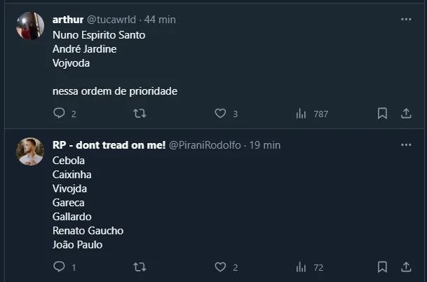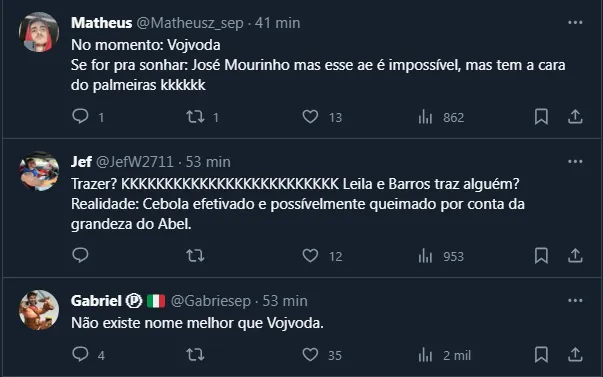 Assim, por mais que a esmagadora maioria queira que o português permaneça, nomes de possíveis substitutos já começaram a ser veiculados por palmeirenses nas redes sociais.