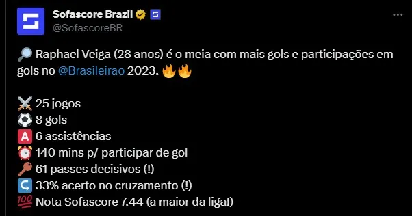 E um dos nomes de destaque e esperança do Palmeiras é Raphael Veiga. Ele gosta de marcar diante do Flamengo, Fez gols no Rubro-Negro nas finais da Supercopa de 2021 e 2023. Além da final da Libertadores também em 2021. Confira os números do camisa 23 no campeonato brasileiro atual. Ele é a esperança do Abel Ferreira e do Palmeiras.