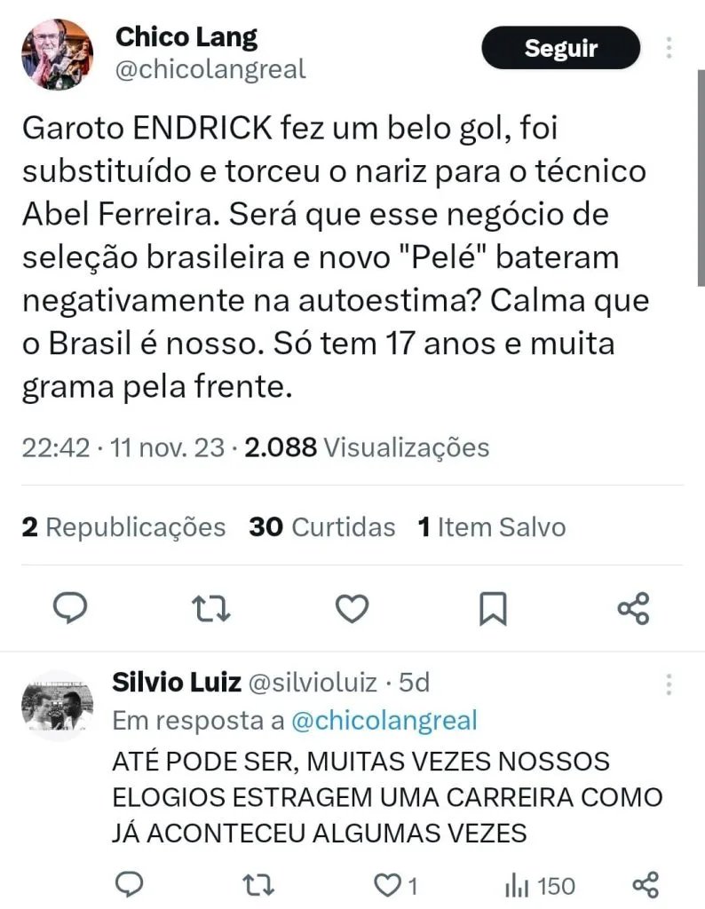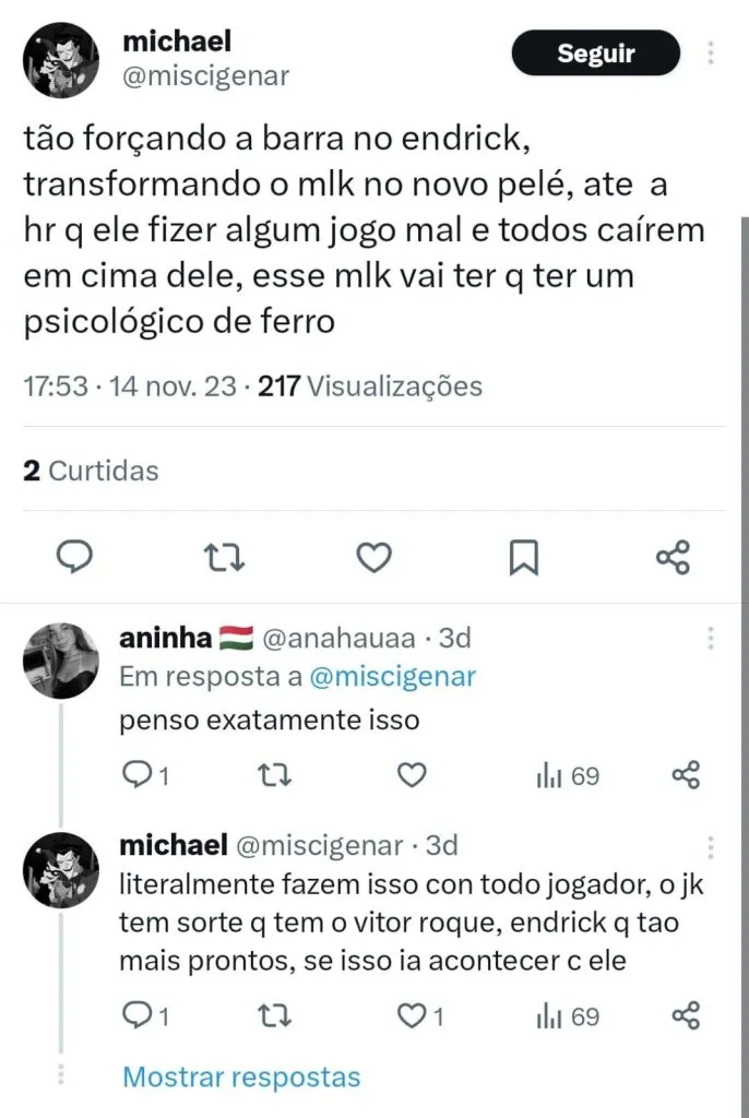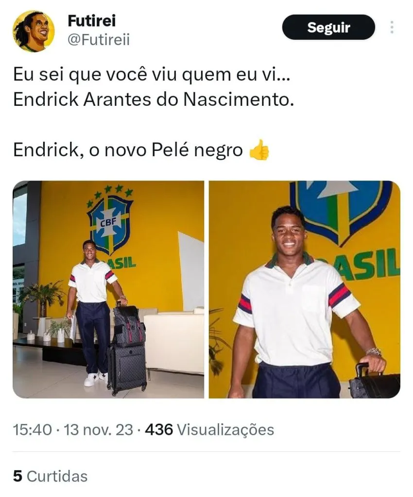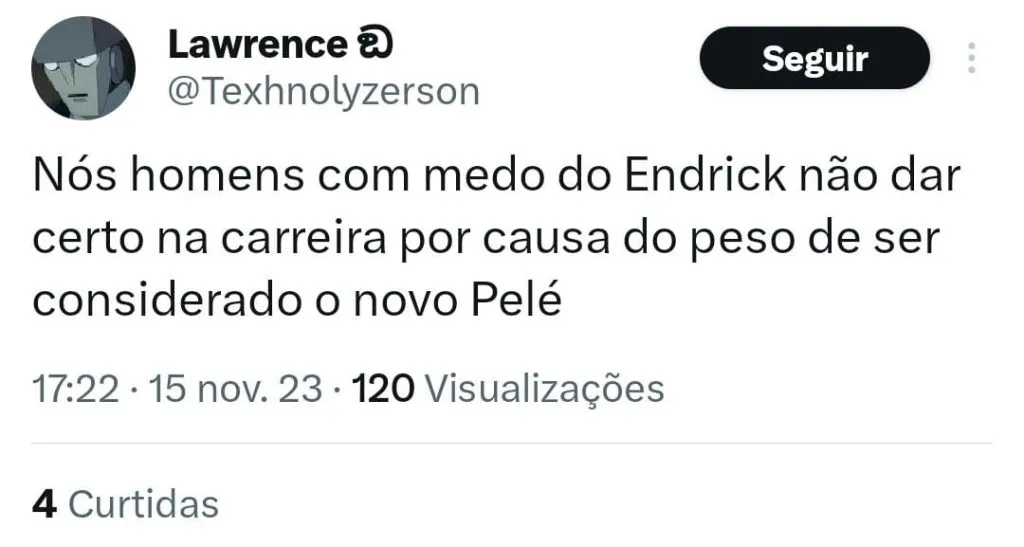 Endrick tem 17 anos, vamos dar tempo ao tempo e deixar que ele cresça e mostre ao mundo tudo que ele pode render. Que ele se inspire no grande Rei do futebol, mas que tenha a leveza de ser quem é, sem tanta pressão ou cobrança.