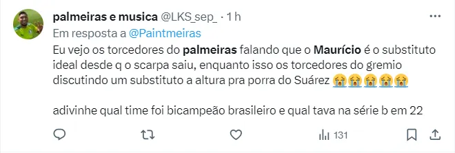 Agora, surge a informação de que o Palmeiras estaria atrás da contratação do meio-campo, Maurício. Para a venda do jogador, segundo o jornalista Benjamin Back, o Inter teria estipulado um valor de 9,5 milhões de euros (R$ 50,8 milhões), por 70% dos direitos econômicos.