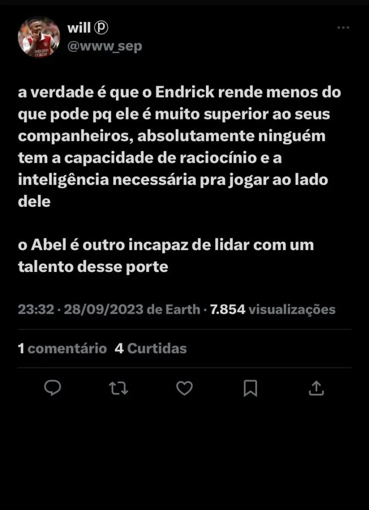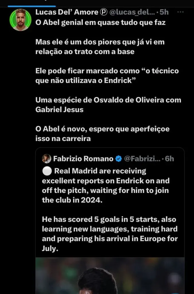 Há vários motivos para o jogador ser titular amanhã, ou pelo menos não entrar nos minutos finais, é decisão, é hora do Abel Ferreira colocar tudo de melhor que ele tem, o Endrick é um dos melhores jogadores do país, seria titular fácil em qualquer outro time. Além disso tudo, a torcida em grande maioria apoia o jogador na titularidade. Fica nítido o quanto o Endrick tem poder de mudar o jogo, ele foi um dos poucos ao criar e causar na primeira partida na Argentina e, olha, ele entrou nos minutos finais. Ainda não se sabe qual time entrará em campo, mas fica aqui a torcida para que entre eles, Endrick seja um dos 11 homens iniciais do Palmeiras.
