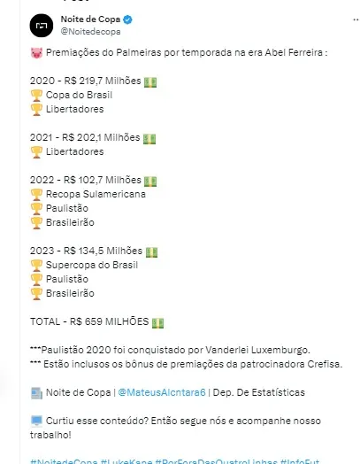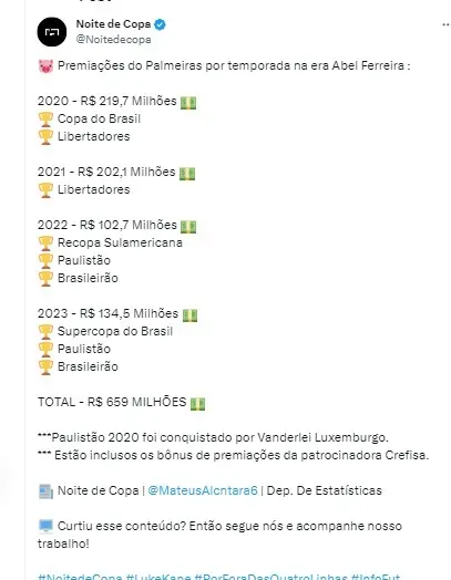 Não podemos esquecer dos altos valores propostas pelos times de fora. Em 2023, deram sangue e suor para Abel Ferreira encerrar seu ciclo no Verdão, porém, ele optou por ficar, principalmente após ganhar mais um título.