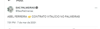 Será um ano cheio para a torcida do Palmeiras, acredito que será bastante promissor. Sei que não dá para avançar no tempo, mas eu bem que queria saber os próximos passos do Clube e principalmente de Abel Ferreira. Afinal, ele fica ou não?