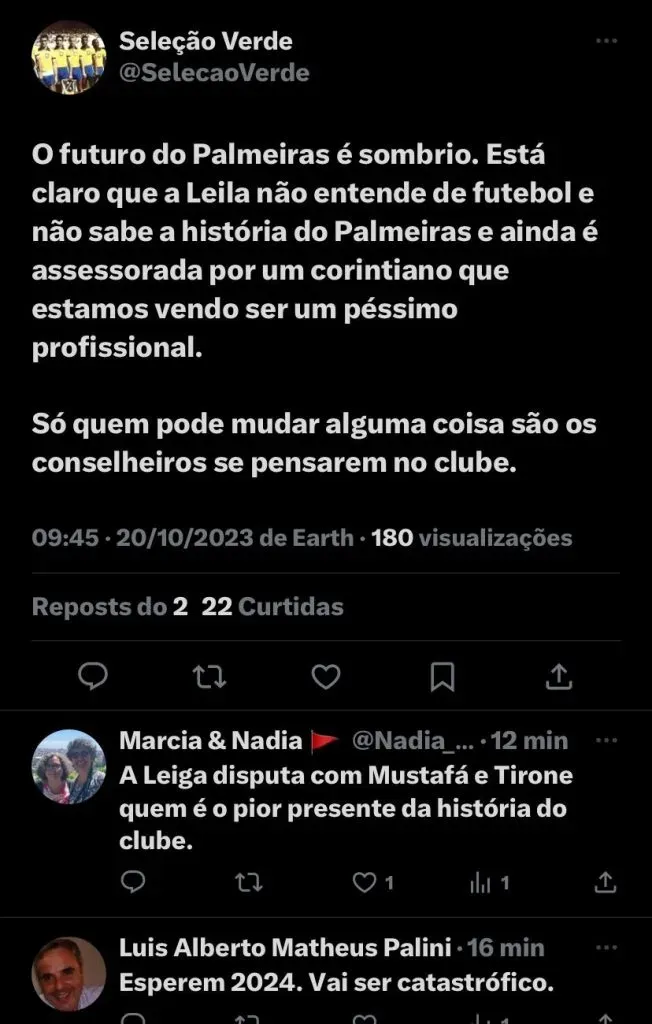 O Palmeiras recebeu nesta quinta-feira (19), o Atlético Mineiro, pela 27ª rodada do Campeonato Brasileiro, no Allianz Parque. O time palmeirense saiu derrotado novamente, desta vez em casa diante da torcida, que protestou contra a presidente Leila Pereira. Em um contexto geral, o Palmeiras vive um caos, isso tem que ser dito, já que há muito tempo não se via tanta coisa dando errada no Clube.