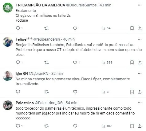 A galera palestrina surfou na onda e esquentou os pedidos pelo jogador. Mas, grande parte se mostrou bastante cética quanto possíveis mobilizações do Palmeiras para acertar com Garro, polemizando sobre o recente histórico de poucas movimentações do Clube no mercado.
