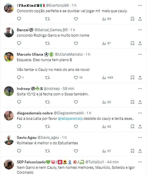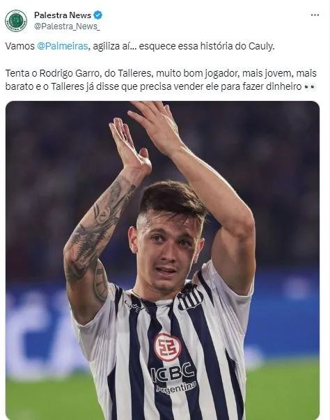 Não há negociações ou sequer interesse da direção sinalizado, mas a torcida do Verdão se manifestou. Um perfil que acompanha o cotidiano do Clube ainda ressaltou: “Esquece essa história do Cauly. Tenta o Rodrigo Garro, do Talleres, muito bom jogador, mais jovem, mais barato e o Talleres já disse que precisa vender ele para fazer dinheiro.”