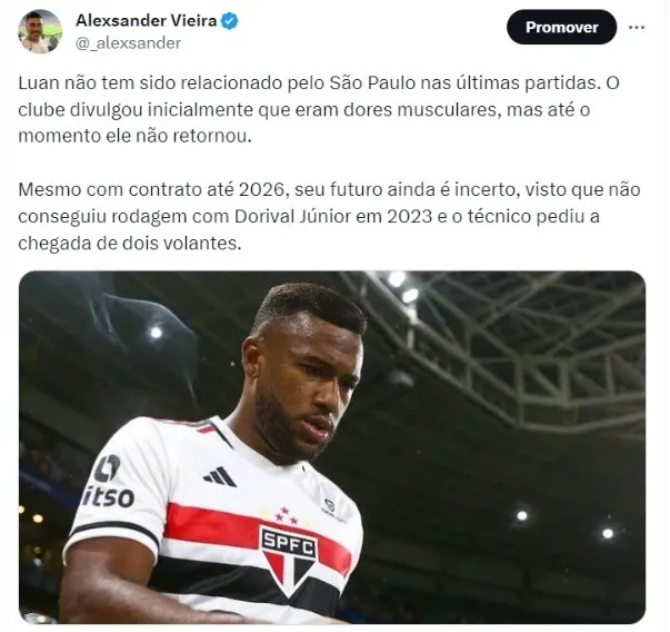 Luan não tem sido relacionado pelo São Paulo nas últimas partidas. O clube divulgou inicialmente que eram dores musculares, mas até o momento ele não retornou.