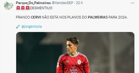 De acordo com informações apuradas pelo jornalista Paulo Vinicius Coelho, no Uol Esporte, o argentino Franco Cervi não é nome em pata no Palmeiras e a princípio não interessa ao time paulista no mercado.