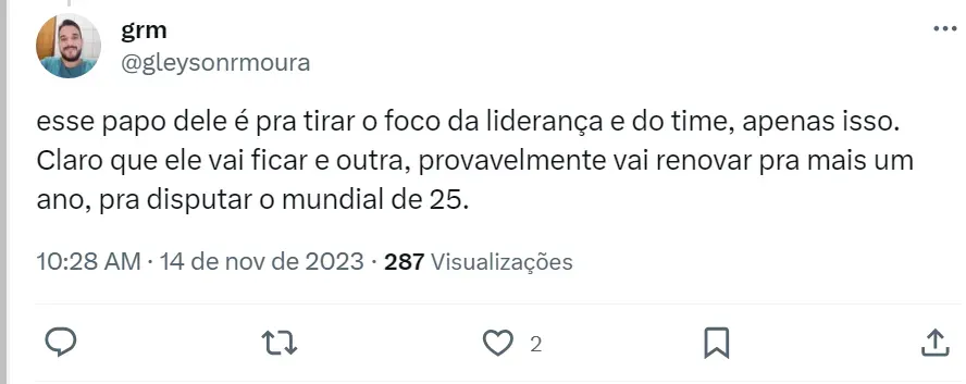Porém, o jornalista Danilo Lavieri, do UOL Esporte, informou que o Palmeiras está “absolutamente confiante” que o treinador vai seguir no Alviverde para a próxima temporada.