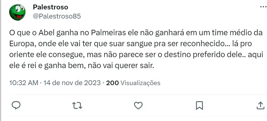 Ele destacou que está cansado pela sequência de jogos e não é isso que o treinador deseja em sua vida. Com essas declarações, foi especulado que Abel poderia deixar o Verdão no fim do ano.