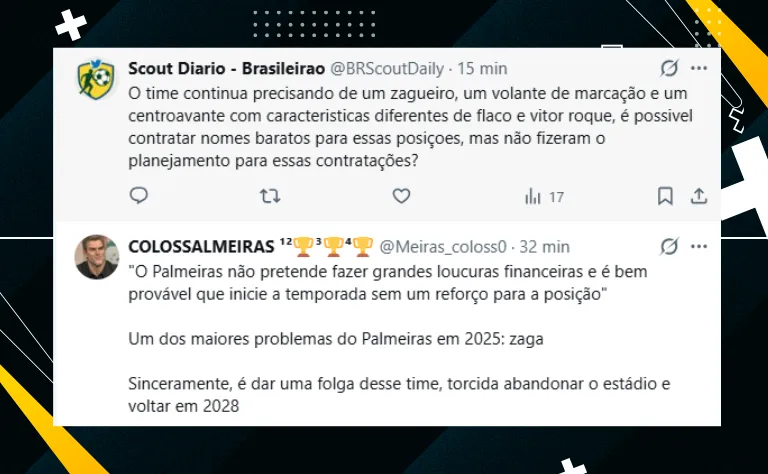 Como a zaga foi um verdadeiro problema para o Palmeiras no ano passado, muitos torcedores foram até a web para questionar a falta de vontade do Clube. Veja alguns comentários sobre a falta de nomes para a zaga: