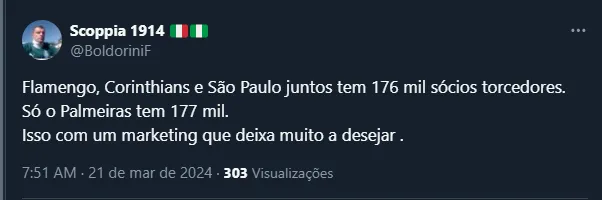 De acordo com um levantamento feito pelo GE, o Palmeiras é o time brasileiro com mais sócios no futebol. Ao todo, são 176.521 pessoas, mas esse número já chegou a ser de 185 mil, em outubro do ano passado, algo que coincide com a ausência do Allianz Parque.