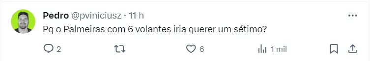 Por conta disso, a gestão vem se manifestando para fechar a chegada de reforços. O técnico Abel Ferreira, aprovou e a equipe paulista está em busca da contratação do jogador Junior Santos, do Botafogo.