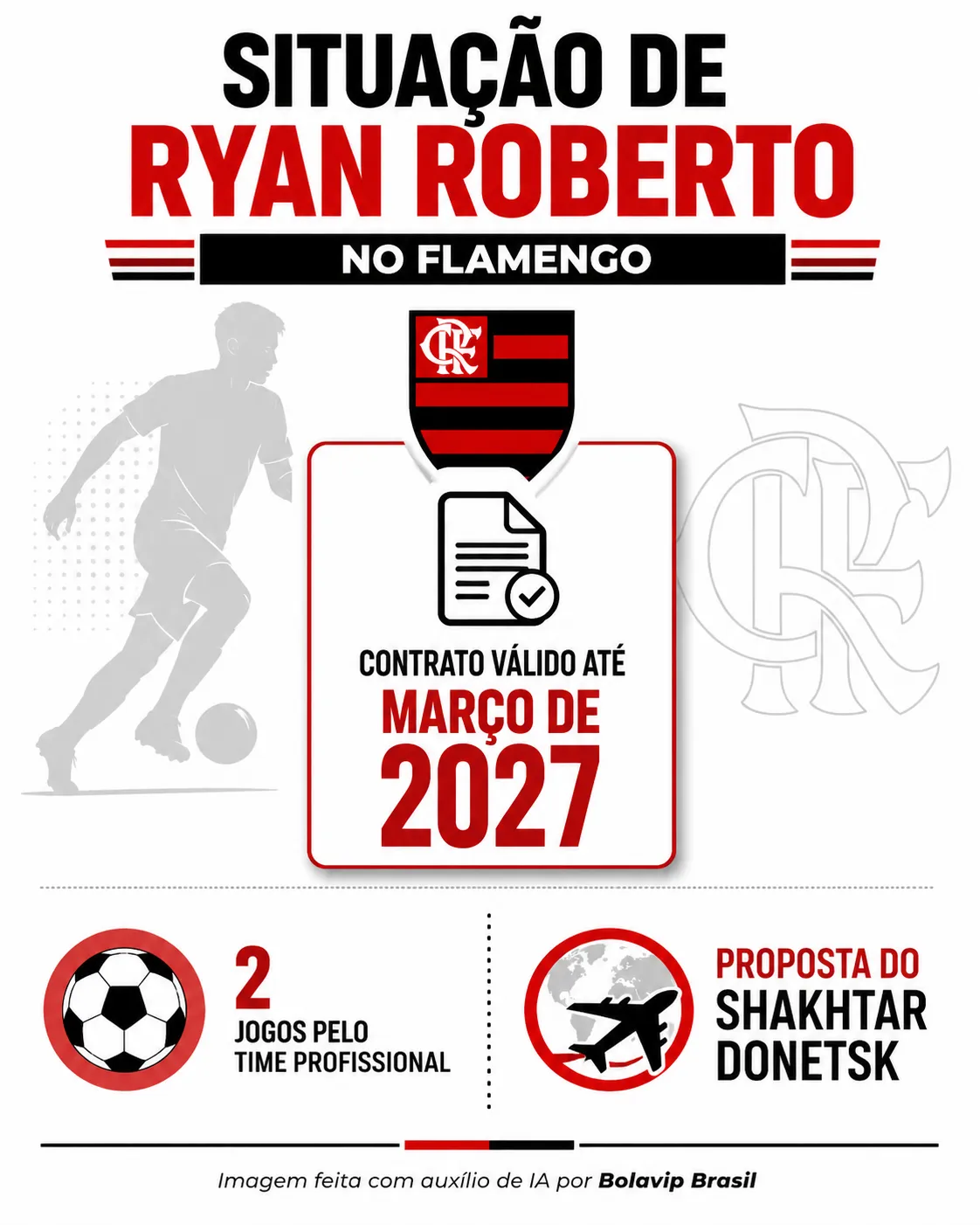 Ryan Roberto possui contrato até março de 2027 e, nos últimos dias, recebeu uma proposta do Shakhtar Donetsk. No atual cenário, o atleta faz parte do elenco sub-20 do Flamengo, atuou em duas partidas pelo profissional.