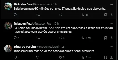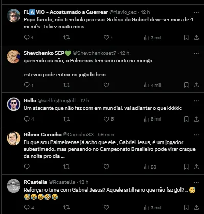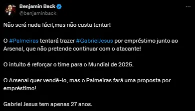 “Não será nada fácil, mas não custa tentar! O Palmeiras tentará trazer Gabriel Jesus por empréstimo junto ao Arsenal, que não pretende continuar com o atacante”, informou o comunicador.