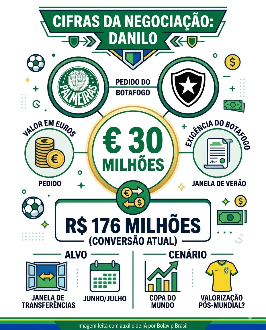 “A novidade é que o Botafogo sonha hoje e pede mais ou menos 30 milhões de euros, cerca de R$ 177 milhões na cotação atual. Esse é o preço mágico para o Botafogo negociar o Danilo no meio do ano, isso sem contar a Copa do Mundo“, informou Bruno Andrade.
