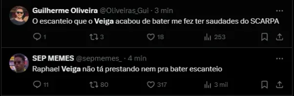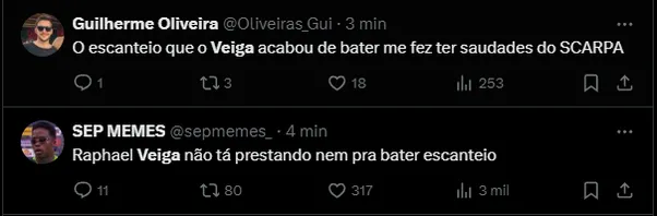 “Nem escanteio o Veiga está acertando. Que jogo ruim hoje“, comentou o palmeirense ainda na 1ª etapa. “Ele está mais preocupado em arrumar o cabelo do que jogar futebol“, foi outro comentário muito curtido em uma rede social.