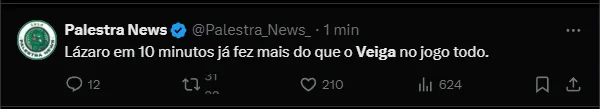 Raphael Veiga foi um dos assuntos durante a 1ª partida da final. O meio-campista não rendeu o esperado, fato que irritou os torcedores. A internet comentou sobre a atuação do jogador, principal nome nas últimas temporadas: “Até agora, a melhor jogada do Veiga foi recuar uma bola para o Weverton“, disse um torcedor.