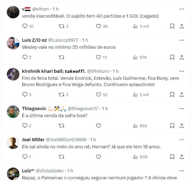 “West Ham encaminha acerto com Luís Guilherme do Palmeiras. Jogador e clube inglês já estão encaminhados no acordo. 30 milhões de euros + variáveis (valores do bônus ainda em sigilo entre os clubes.) Acordo próximo“, escreveu o jornalista.