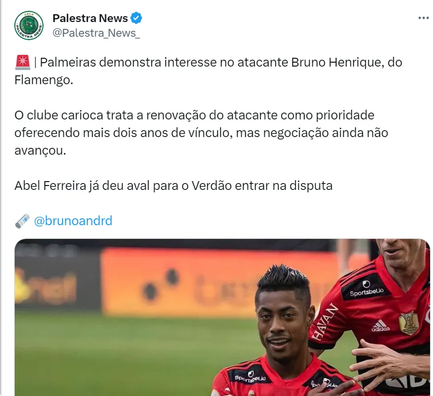 Segundo os dois jornalistas, o Palmeiras busca um atacante de peso para atuar pelos lados do campo e o nome de Bruno Henrique tem o aval do treinador Abel Ferreira. Uma primeira sondagem ao jogador já foi feita. O atacante de 32 anos se tornou ídolo do Mengão nos últimos anos, com títulos como a Copa Libertadores e o Campeonato Brasileiro. Além do Palmeiras, outros times brasileiros já sinalizaram interesse em contratar o camisa 27.