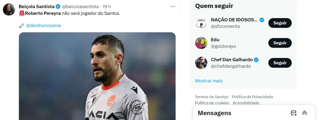 Nossa reportagem apurou que o Santos ofereceu R$ 400 mil por mês, porém Pereyra disse ‘não’. A recusa, pelo menos, de momento também atingiu ao Palmeiras, porém as janelas na Europa ficam abertas até esta sexta-feira (1). O nome do argentino ainda se mantém em ‘stand-by’ nas alamedas da rua Palestra Itália.