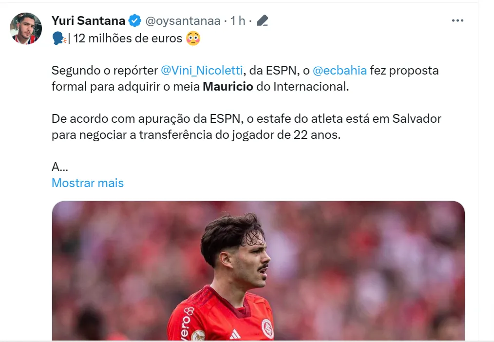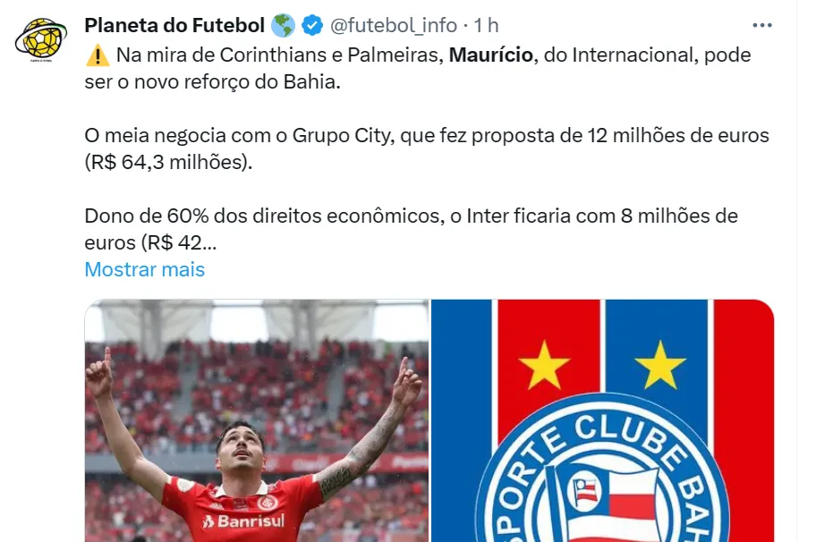 Segundo informações do jornalista Vinícius Nicoletti, o grupo City, que comprou a SAF do Bahia, negocia com o staff de Maurício para a sua compra na casa dos 12 milhões de euros (R$ 64,3 milhões).