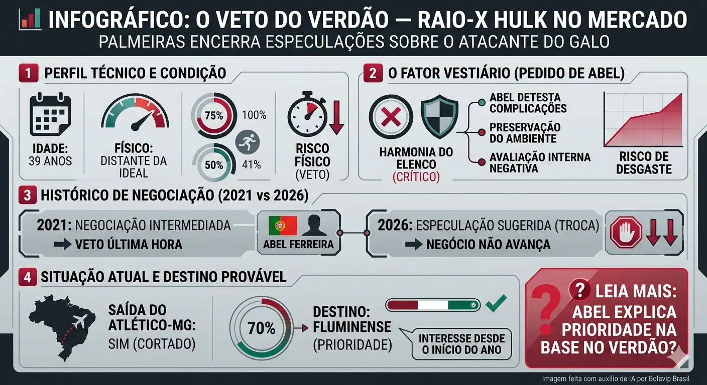 No entanto, Abel Ferreira de última hora vetou a contratação de Hulk em 2021. Com isso, ele acabou fechando com o Atlético-MG. A recusa do técnico do Verdão dividiu opiniões de torcedores na época.