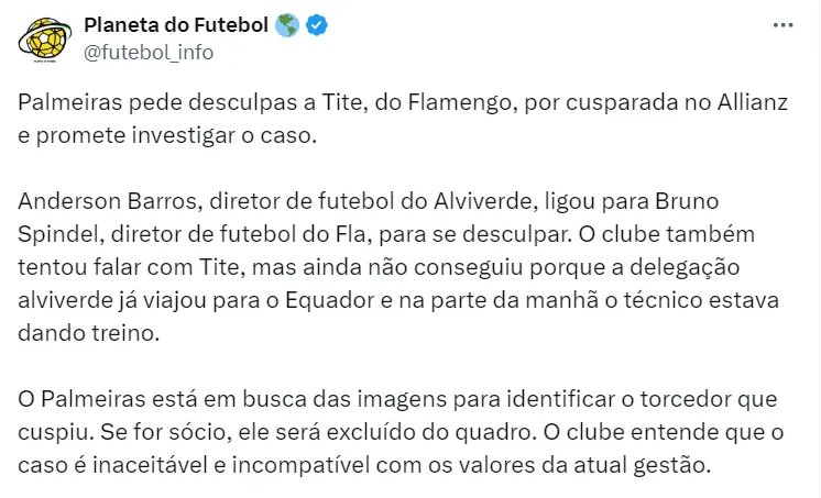 Vale destacar que o Palmeiras ficou ciente da história durante a coletiva de imprensa de Tite. O clube entende que, se fosse alertado imediatamente, o torcedor seria retirado do local.