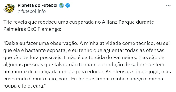 Nesta terça-feira (23), o Palmeiras informou que identificou o torcedor que cuspiu em Tite, treinador do Flamengo. O ato aconteceu no último domingo (21), no duelo entre os times.