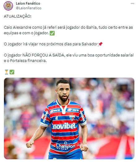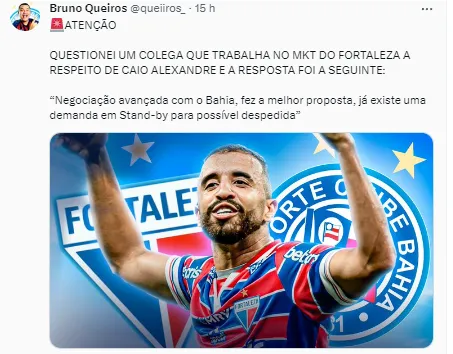 Em suas redes sociais, o colega Bruno Queirós destacou que entrou em contato com uma fonte dentro do Fortaleza para saber mais sobre a situação e descobriu que no Leão do Pici já está se trabalhando com a despedida de Caio Alexandre.
