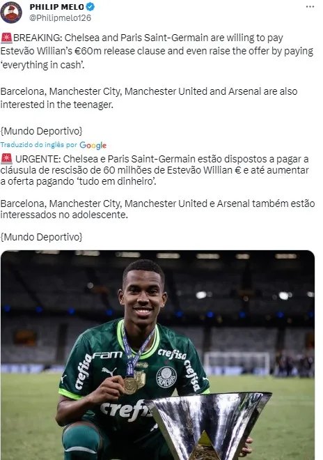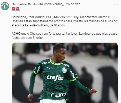 A multa rescisória do jovem atacante está na casa dos 60 milhões de euros (quantia que corresponde a aproximadamente cerca de R$ 322 milhões na cotação atual). Estevão já vem sendo destaque no futebol há muito tempo e vale lembrar que ele ainda tem 16 anos.