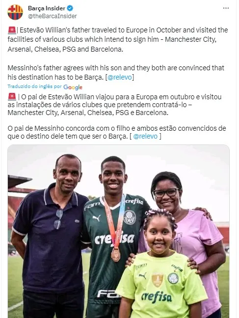 Conforme apuração trazida pelo Uol, Barcelona, Manchester City, Manchester United, Arsenal, Chelsea e PSG são alguns dos gigantes europeus que estariam interessados na contratação de Estevão.