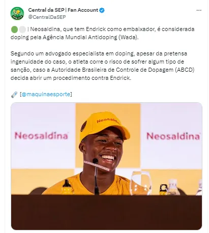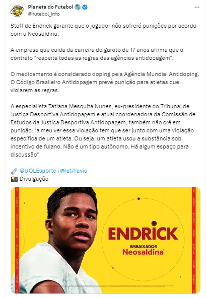 Por outro lado, os agentes do atacante Endrick garantem que não existem chances do jogador ser pego no doping. Eles afirmaram que o contrato firmado entre o atleta e a marca de medicamentos respeita todas as regras da agência de antidopagem.