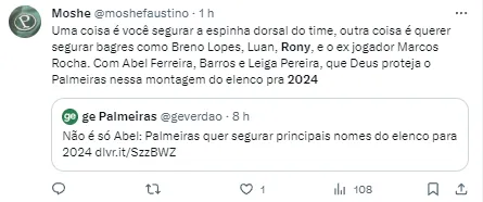 “Cara, eu tenho contrato com o Palmeiras até 2026 e tudo indica que eu vou permanecer no clube. Até agora não chegou nada para mim, nada concreto. A gente sabe que quando se trata de futebol ele é muito imprevisível, as coisas acontecem muito rápido”, confirmou Rony.