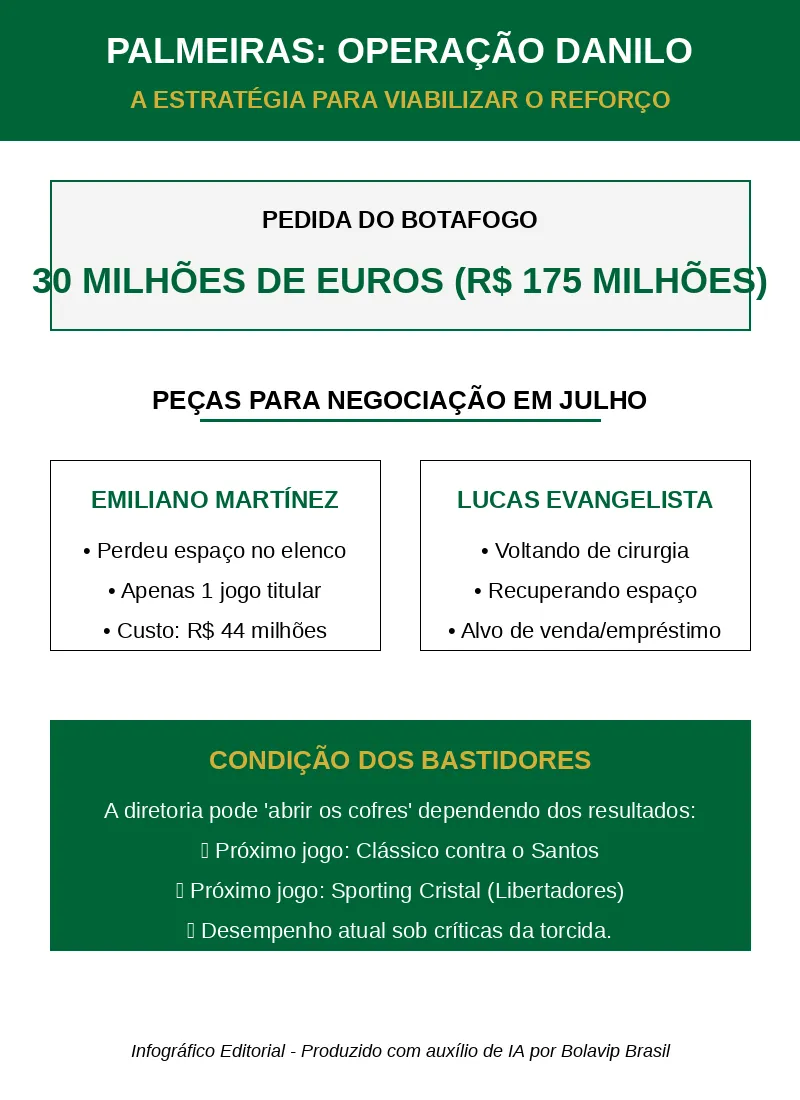O Palmeiras tem interesse em contratar Danilo, do Botafogo, na janela de julho, mas é um investimento alto: o clube carioca acena com valor de 30 milhões de euros (R$ 175 milhões na cotação atual) para vender o jogador.