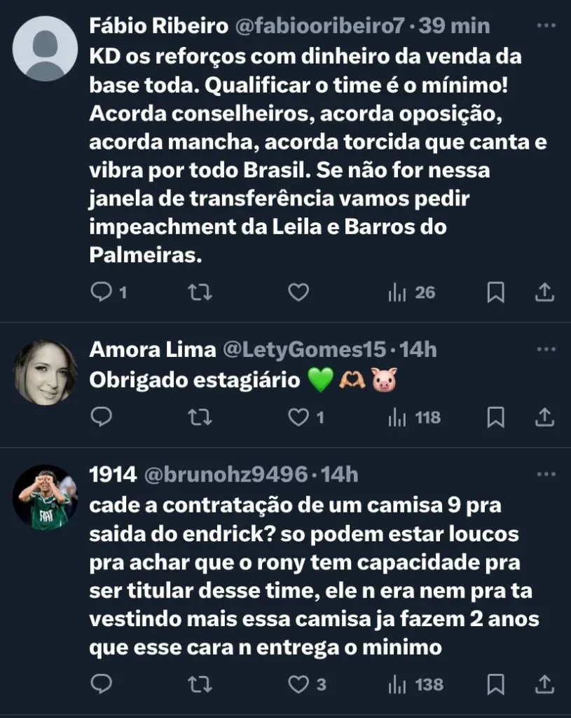 Até o momento, o Verdão garantiu R$ 340 milhões com as vendas de: Endrick (Real Madrid), Artur (Zenit), Kevin (Shakhtar), Merentiel (Boca Juniors), Angulo (Orlando City), Matheus Fernandes (RB Bragantino) e Breno (Shabab Al Ahli).