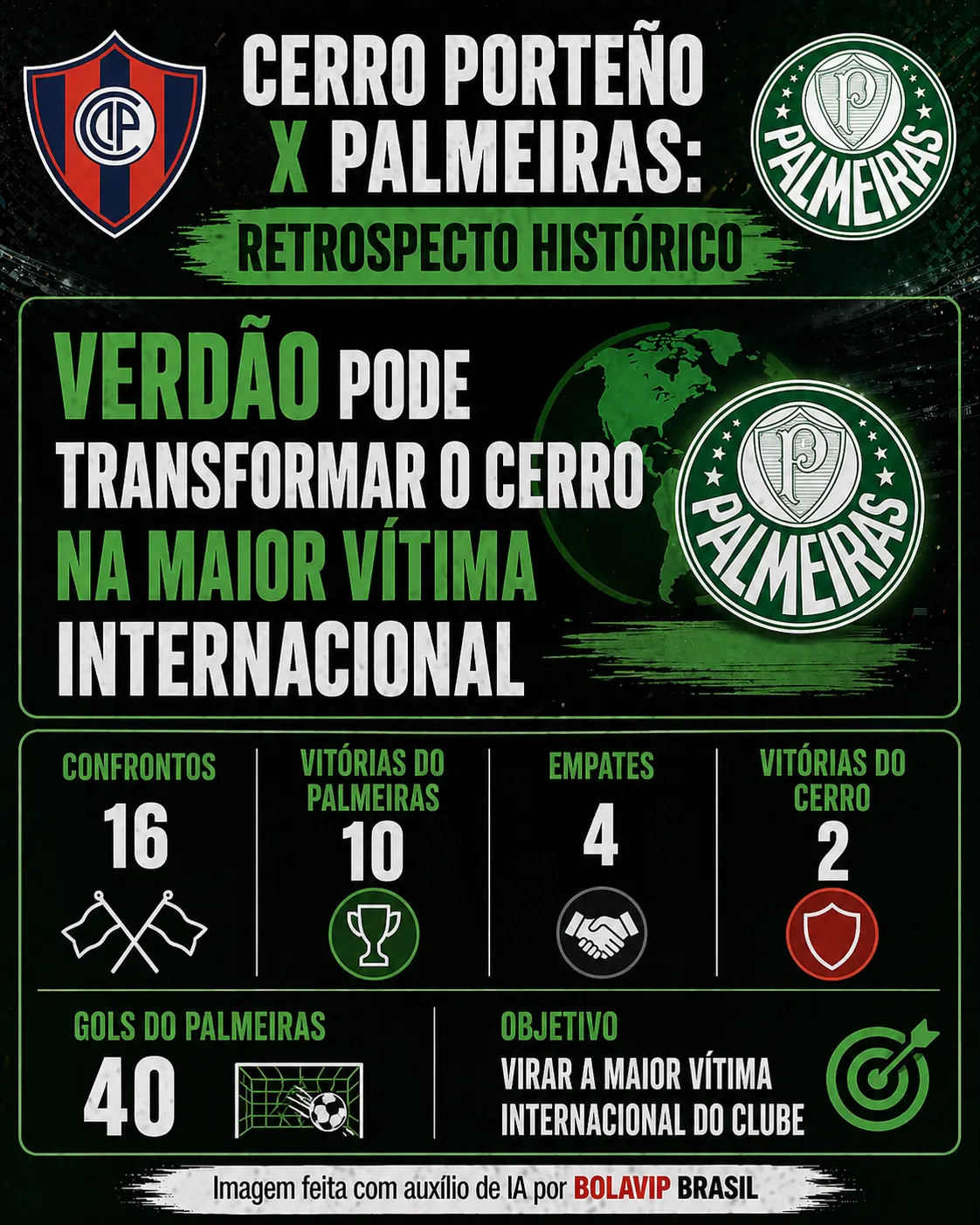 Isso porque, diante do Cerro, o Porco pode transformar a equipe paraguaia em sua maior vítima internacional. Até o presente momento, os clubes se enfrentaram 16 vezes, com dez vitórias palmeirenses, quatro empates e duas vitórias paraguaias.