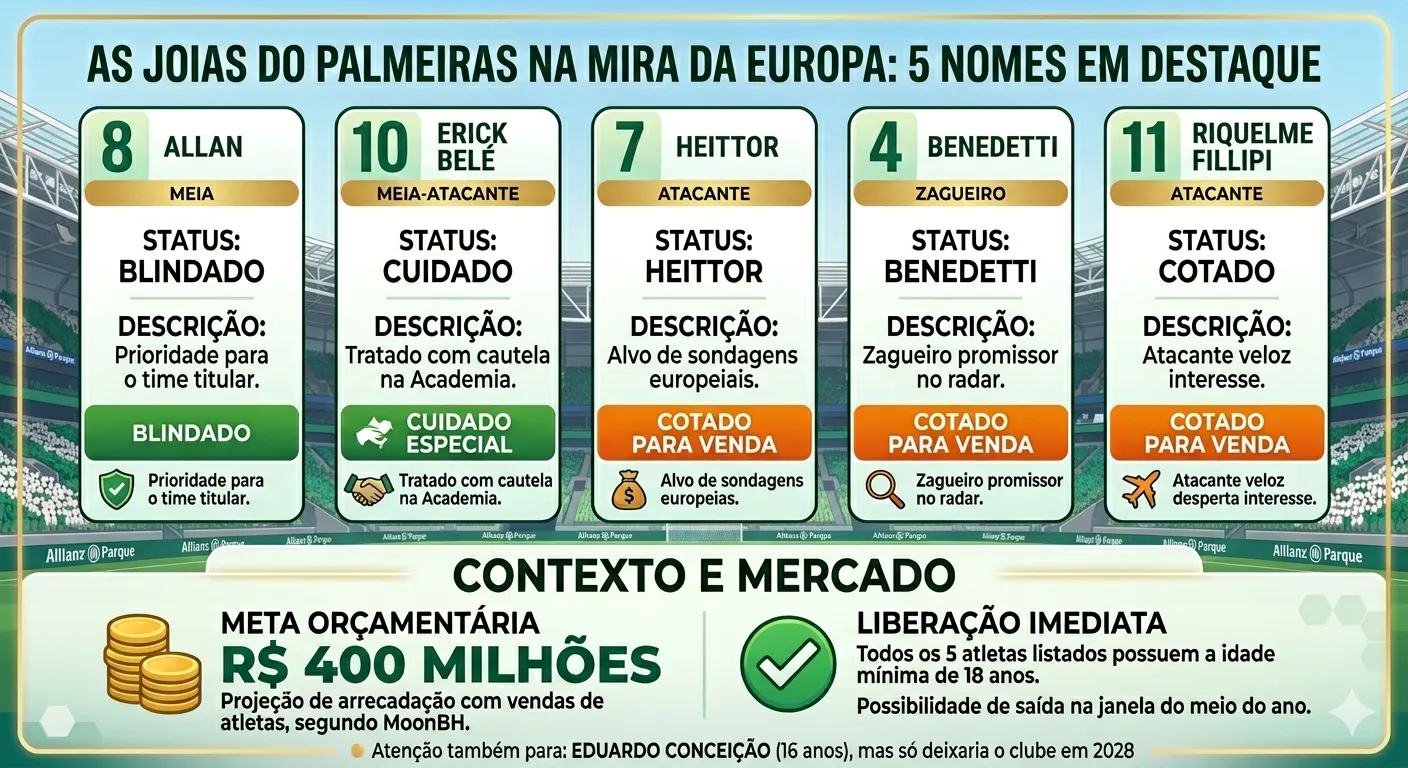 Palmeiras pode vender 5 joias para Europa: Allan, Erick Belé, Heittor, Benedetti e Riquelme Fillipi