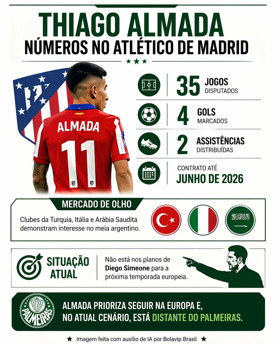No início do ano, quando o Palmeiras demonstrou interesse em uma contratação, Almada deixou claro o interesse em continuar na Europa, seguiu no Atlético de Madrid visando a Copa do Mundo de 2026.