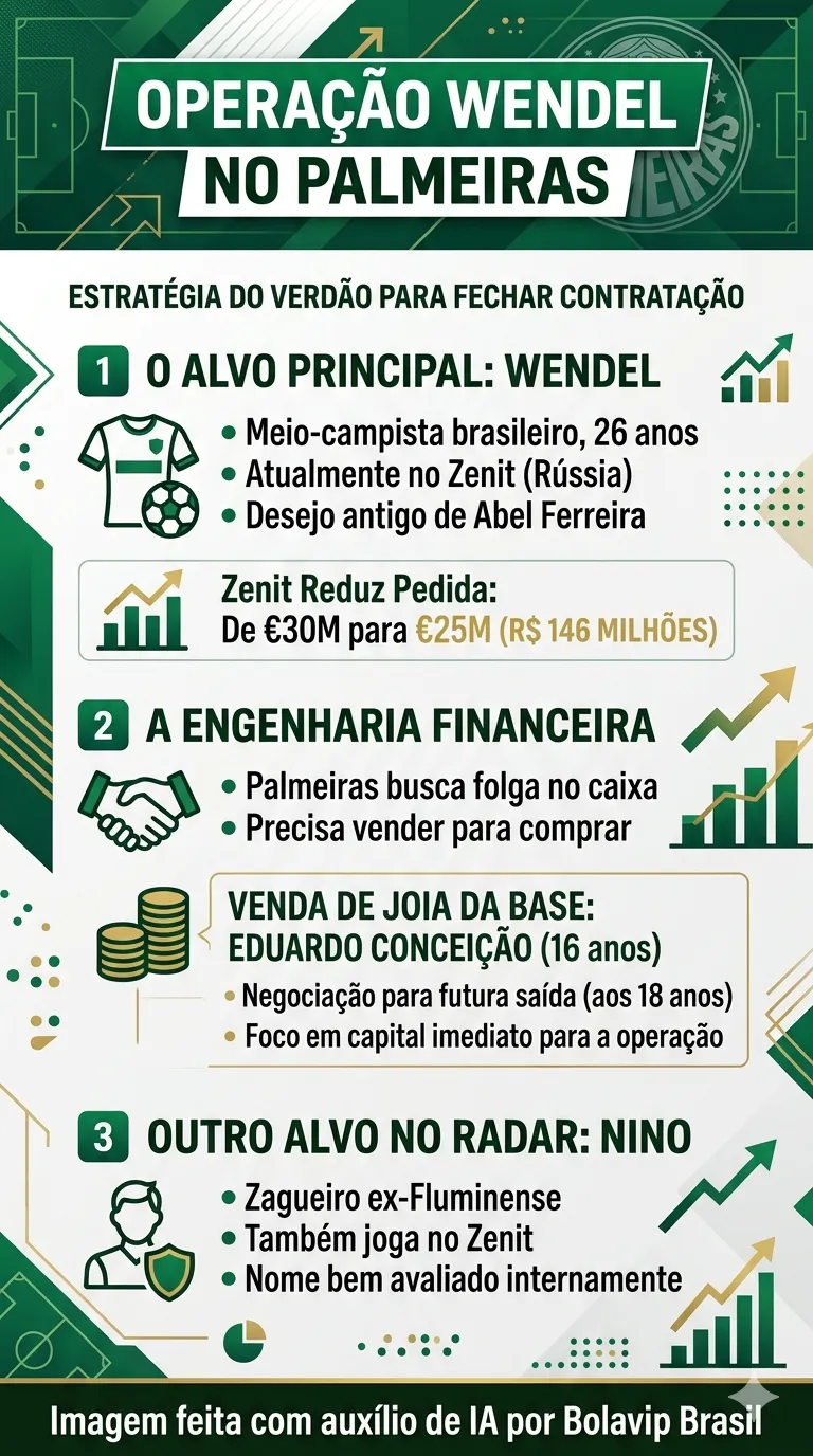 Uma situação que anima o Palmeiras foi trazida pela apuração da reportagem do portal, é que os Zenit teria abaixado a pedida por Wendel e agora o valor para negócio está em 25 milhões de euros (R$ 146 milhões).