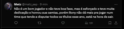 “Tem um monte de história acontecendo pensando no mercado na próxima janela. Agora, surgiu a hipótese de uma troca envolvendo o Rony para o meio do ano”, disse.