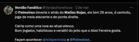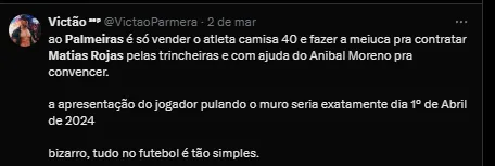 “Quero esclarecer que ninguém do Palmeiras cogita a possibilidade de contratar o Matías Rojas. O entendimento é de que ele é um jogador normal, que se tornou supervalorizado com a transferência para o Corinthians, com salários, luvas e direitos de imagens na casa de R$ 1 milhão por mês”, iniciou o jornalista.