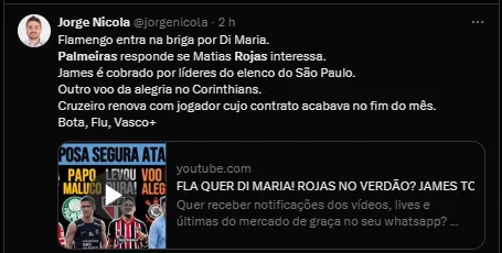 “Aníbal que chegou muito forte no Palmeiras e foi companheiro do próprio Matías Rojas no Racing. A relação de amizade entre os dois e ele teria indicado para o Abel, enfim… A informação que tenho é diferente: o Palmeiras não vai contratar (o Rojas)”, encerrou Nicola.