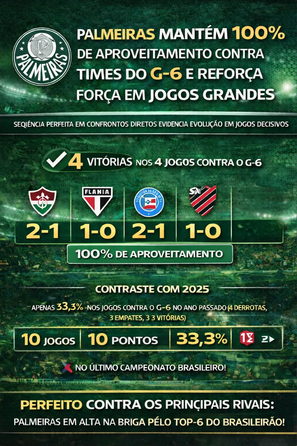 O triunfo diante da equipe de Curitiba, além da superação de jogar com um jogador a menos durante praticamente todo o segundo tempo, melhorou um aspecto que foi duramente criticado no Alviverde no ano passado: o desempenho contra as equipes do G-6 (os seis primeiros colocados na competição).
