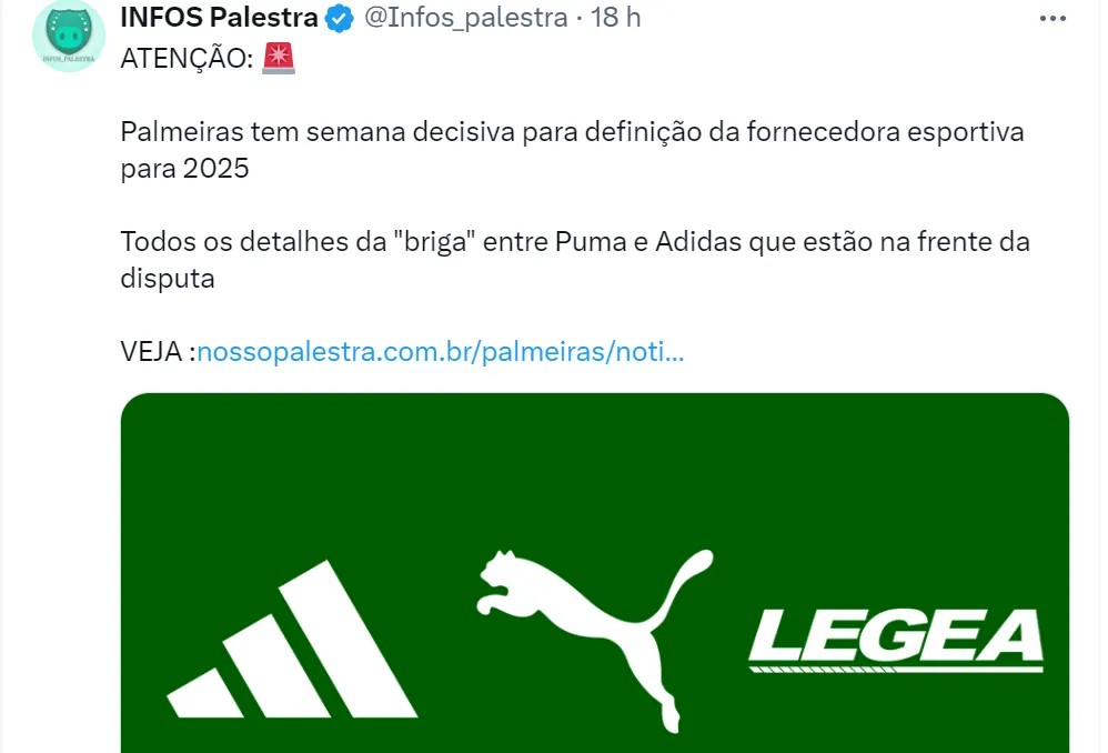 Já a Adidas é também muito bem quista entre os torcedores palmeirenses nas redes sociais. Os alemães patrocinaram anteriormente o Verdão em duas oportunidades e a empresa sinalizou o desejo de voltar, após encerrar o contrato com o São Paulo no fim de 2023.