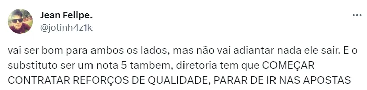 O técnico português já teria afirmado nos bastidores que não quer perder o camisa 19, tendo em vista que o jogador por vezes entrou durante as partidas e teve boas atuações, mesmo não sendo titular.