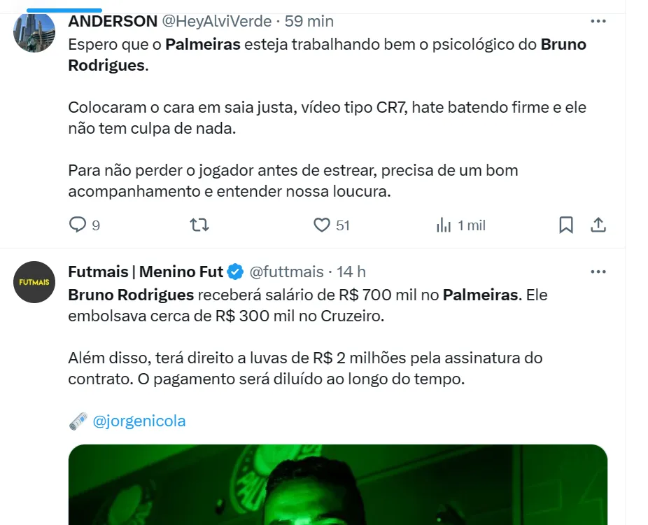 Afinal, os palmeirenses continuam ávidos por uma contratação de maior impacto. Bruno Rodrigues, a maioria considera, é tratado como mais uma aposta no mercado.